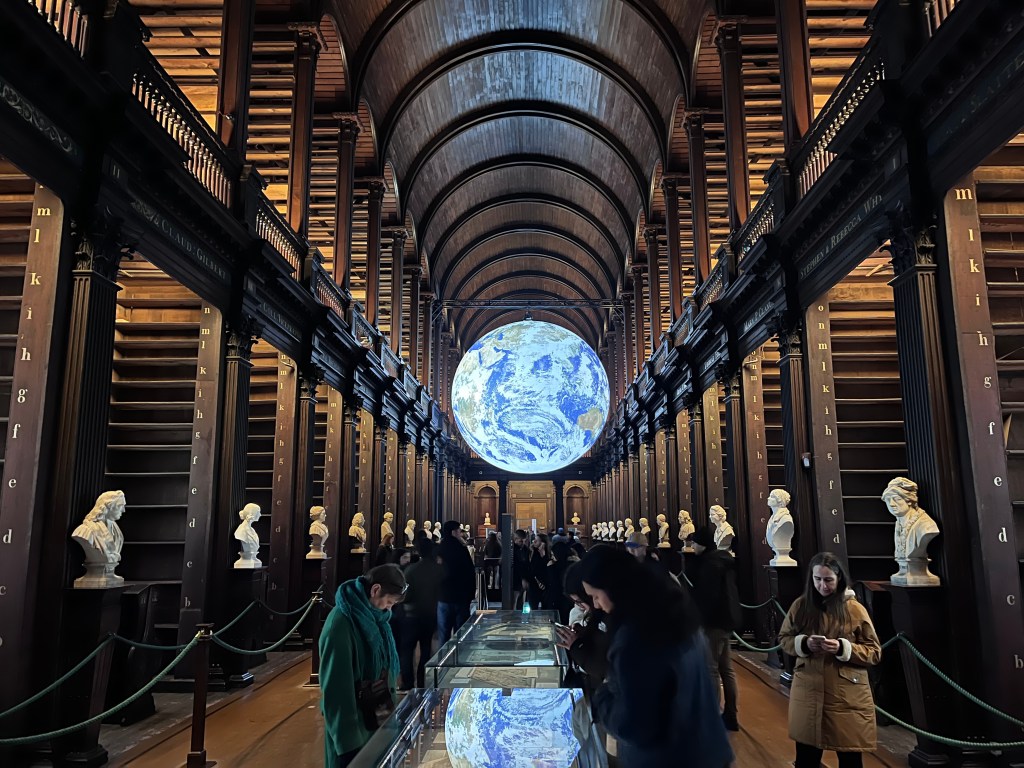 Trinity College was given the book in 1661 and is their most prized possession, no photography and a security guard to enforce it. The library’s purpose centers around preservation of literature, every published book in Ireland must be provided to The Old Library, which explains the cleared out shelves for our visit. While slightly disappointing in that regard it was very cool to learn about and see such an old and historic piece of literature and art in person.